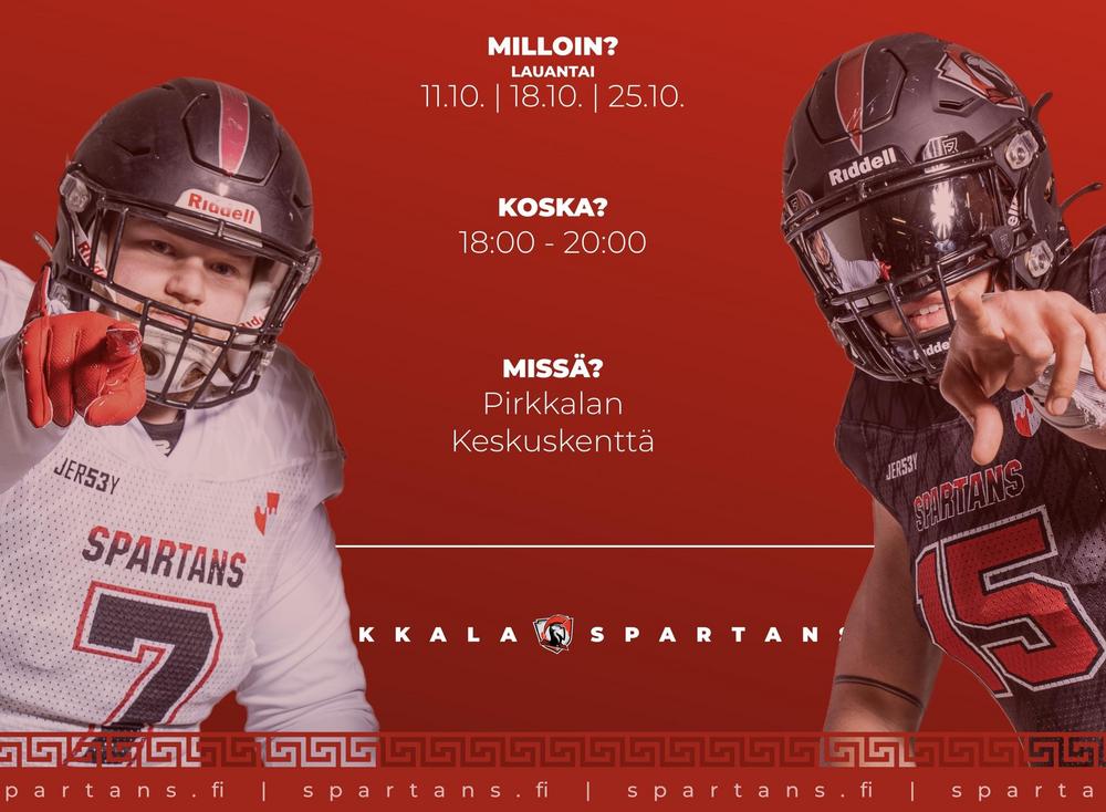 Pirkkala Spartans kutsuu kaikki amerikkalaisesta jalkapallosta kiinnostuneet naiset ja miehet mukaan avoimiin harjoituksiin lokakuussa! Treenit järjestetään lauantaisin 11.10., 18.10. ja 25.10. klo 18–20 Pirkkalan Keskuskentällä.